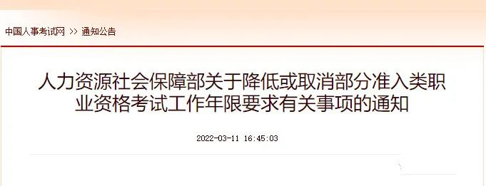 終于來了!人社部正式發布《人力資源社會保障部關于降低或取消部分準入類職業資格考試工作年限要求有關事項的通知》,自2022年起實施。
