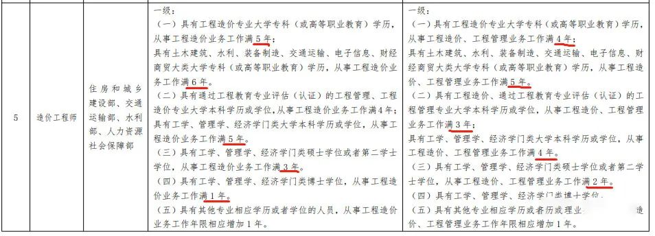 具有土木建筑、水利、裝備制造、交通運輸、電子信息、財經商貿大類大學專科(或高等職業教育)學歷,從事工程造價、工程管理業務工作滿5年。