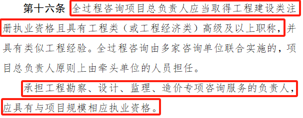 承擔(dān)工程勘察、設(shè)計、監(jiān)理、造價等專項咨詢服務(wù)的負責(zé)人,應(yīng)具有與項目規(guī)模相應(yīng)執(zhí)業(yè)資格。