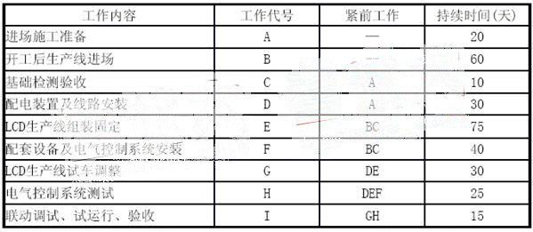 2006(二)南方電子電氣有限公司(建設(shè)單位)新建液晶屏(LCD)生產(chǎn)車間,其生產(chǎn)線由建設(shè)單位從國(guó)外訂購(gòu),A 施工單位承包安裝。A 施工單位進(jìn)場(chǎng)時(shí),生產(chǎn)車間的土建工程和機(jī)電配套工程(B 施工單位承建)已基本完工。A 施工單位按合同工期要求,與建設(shè)單位、生產(chǎn)線供應(yīng)商和B施工單位洽談,編制了LCD 生產(chǎn)線安裝網(wǎng)絡(luò)計(jì)劃工作的邏輯關(guān)系及工作持續(xù)時(shí)間表(見(jiàn)下表)。LCD 生產(chǎn)線安裝網(wǎng)絡(luò)計(jì)劃工作邏輯關(guān)系及持續(xù)時(shí)間表