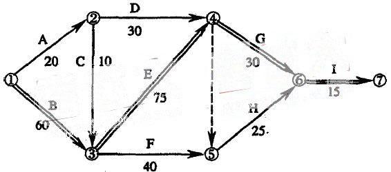 影響工期的關(guān)鍵工作是:生產(chǎn)線進(jìn)場(chǎng)(1 分),生產(chǎn)線組裝固定(1分),生產(chǎn)線試車調(diào)整(1分),聯(lián)動(dòng)調(diào)試、試運(yùn)行、驗(yàn)收(1 分),總工期為180 天(1 分)。(關(guān)鍵線路為1-3-5-6-7)