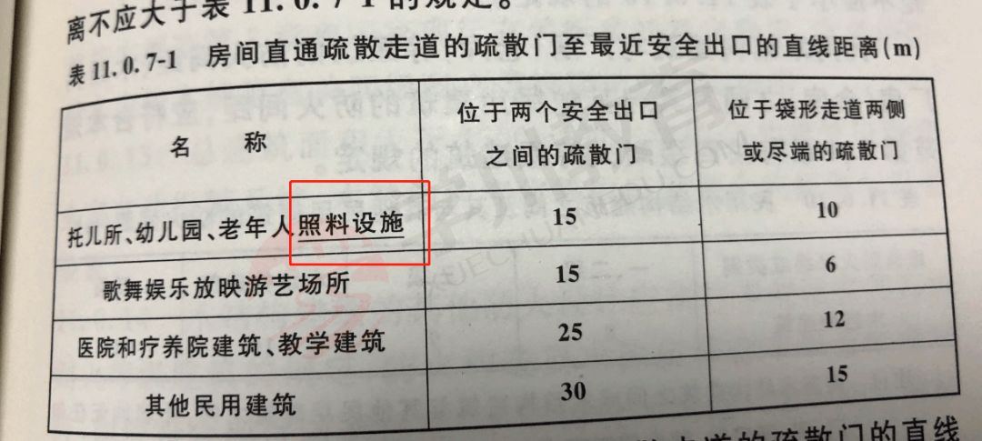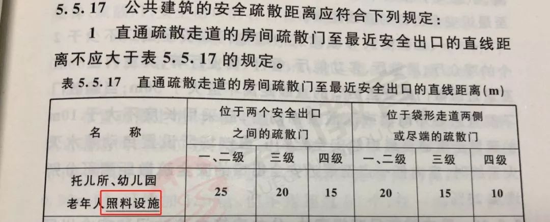 5、老年人照料設(shè)施直通疏散走道的房間門至最近安全出口的直線距離不應(yīng)大于下表的要求: