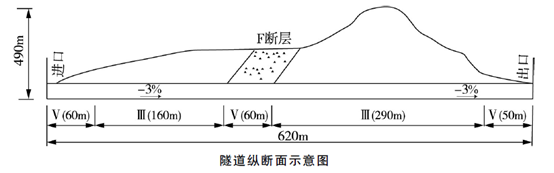 某雙車道公路隧道。全長(zhǎng)620m,地層巖性為石灰?guī)r,地下水豐富有一條F斷層破裂帶隧道最大埋深490m,縱坡為-3%。其圍巖級(jí)別及長(zhǎng)度見(jiàn)隧道縱段面示意圖3.合同總工期為20個(gè)月為保證施工安全,施工單位結(jié)合項(xiàng)目地質(zhì)和設(shè)備條件,擬在全斷面法、臺(tái)階法、單側(cè)壁導(dǎo)坑法、CD法、CRD法5種工法中選擇組織施工。
