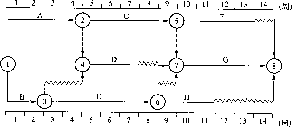 從時(shí)標(biāo)網(wǎng)絡(luò)圖中工作E后面直至終點(diǎn)的2條線路來看,E工作的總時(shí)差為1周。如果工作E實(shí)際進(jìn)度延誤了4周,則會對原基礎(chǔ)工程施工進(jìn)度計(jì)劃的工期影響3周(4-1=3周)。故B正確。