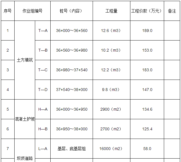 事件一:施工單位根據現場具體情況,將土方填筑、混凝土護坡、堤頂道路、草皮護坡工程施工分別劃分為4個、2個、2個、2個作業組,具體情況如表5-2所示。