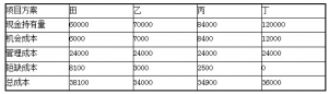 33.【2011年真題】某企業有甲、乙、丙、丁四個現金持有方案,各方案的現金持有量依次是60000元、70000元、84000元、120000元。四個方案的機會成本均為現金持有量的10%,管理成本均為24000元,短缺成本依次是8100元、3000元、2500元和0元。若采用成本分析模式進行現金持有量決策,該企業應采用( )方案。