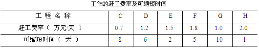事件一:由于施工單位人員及材料組織不到位,工程開工后第 33 天上班時(shí)工作 D 才開始。為了確保按合同工期竣工,施工單位決定調(diào)整施工總進(jìn)度計(jì)劃。經(jīng)分析,各項(xiàng)未完成工作的趕工費(fèi)率及可縮短時(shí)間見下表。