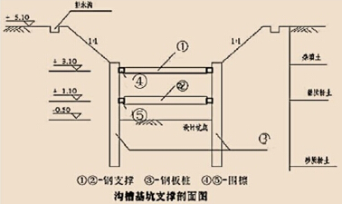 事件一:項目部進場后立即編制施工組織設計,擬將表層雜填土放坡挖除后再打設鋼板樁,設置兩道水平鋼支撐及型鋼圍檁,溝槽支護如下圖所示。溝槽擬采用機械開挖至設計標高,清槽后澆筑混凝土基礎,混凝土直接從商品混凝土輸送車上卸料到坑底。