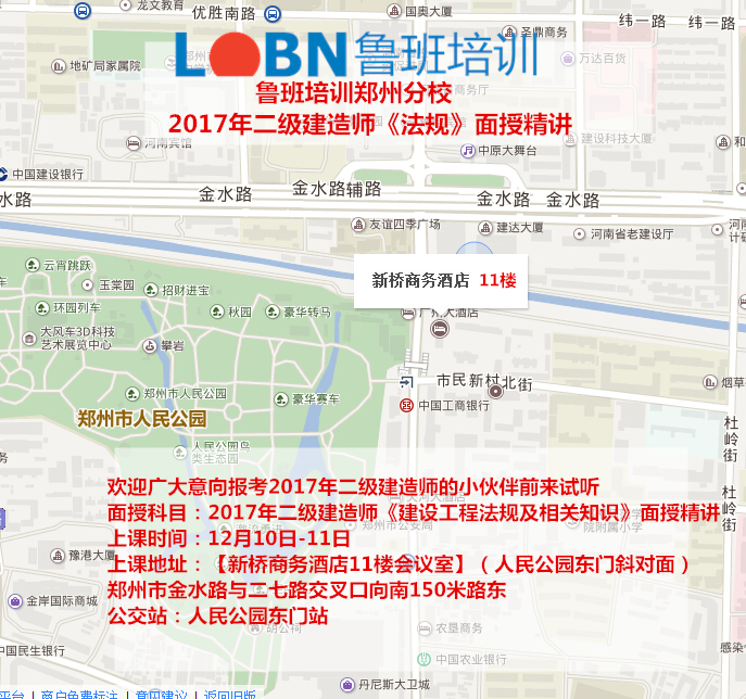 上課地址:【新橋商務酒店11樓會議室】鄭州市金水路與二七路交叉口向南150米路東(人民公園東門斜對面)