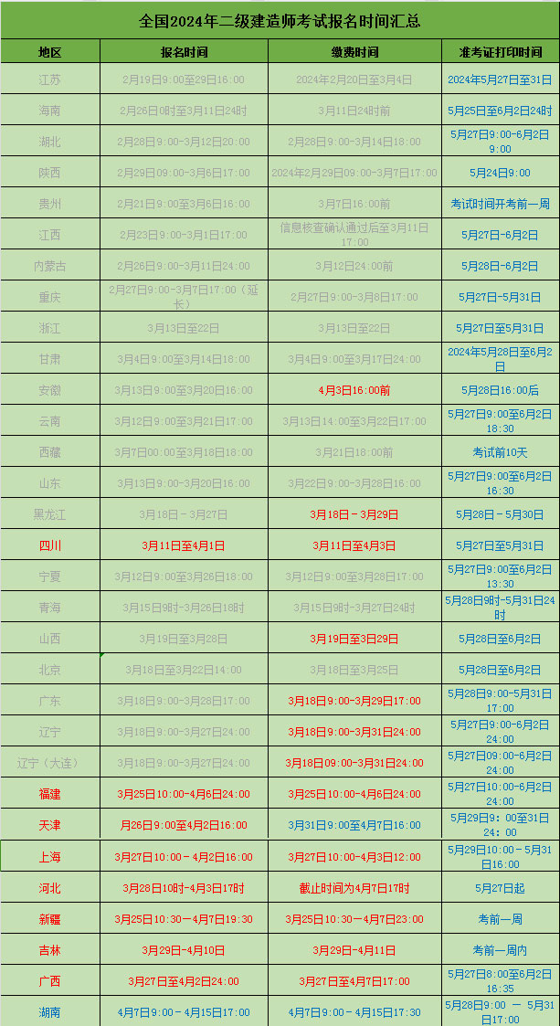 31地區(qū) 二級建造師報名時間匯總