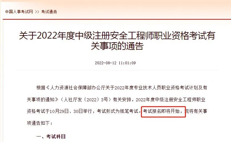 關(guān)于2022年度中級(jí)注冊(cè)安全工程師職業(yè)資格考試有關(guān)事項(xiàng)的通告