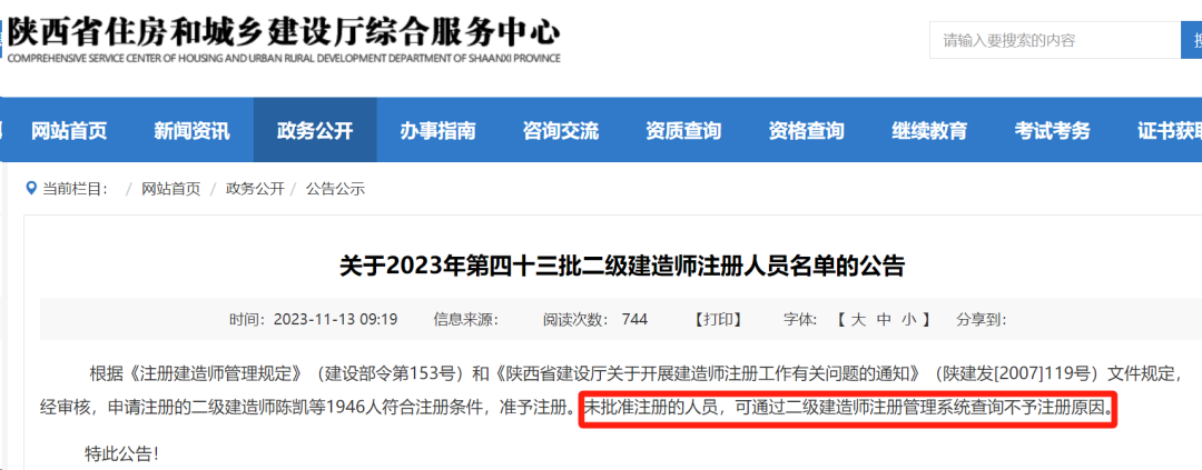 以陜西為例,陜西省住房和城鄉建設廳綜合服務中心于2023年11月13日發布《關于2023年第四十三批二級建造師注冊人員名單的公告》,里面提到“未批準注冊的人員,可通過二級建造師注冊管理系統查詢不予注冊原因”。