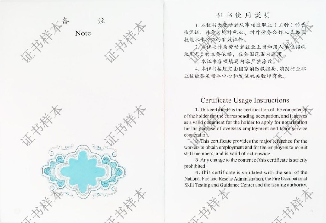 新版消防行業(yè)職業(yè)資格證書封底、封一式樣(四級(jí)/中級(jí)工)