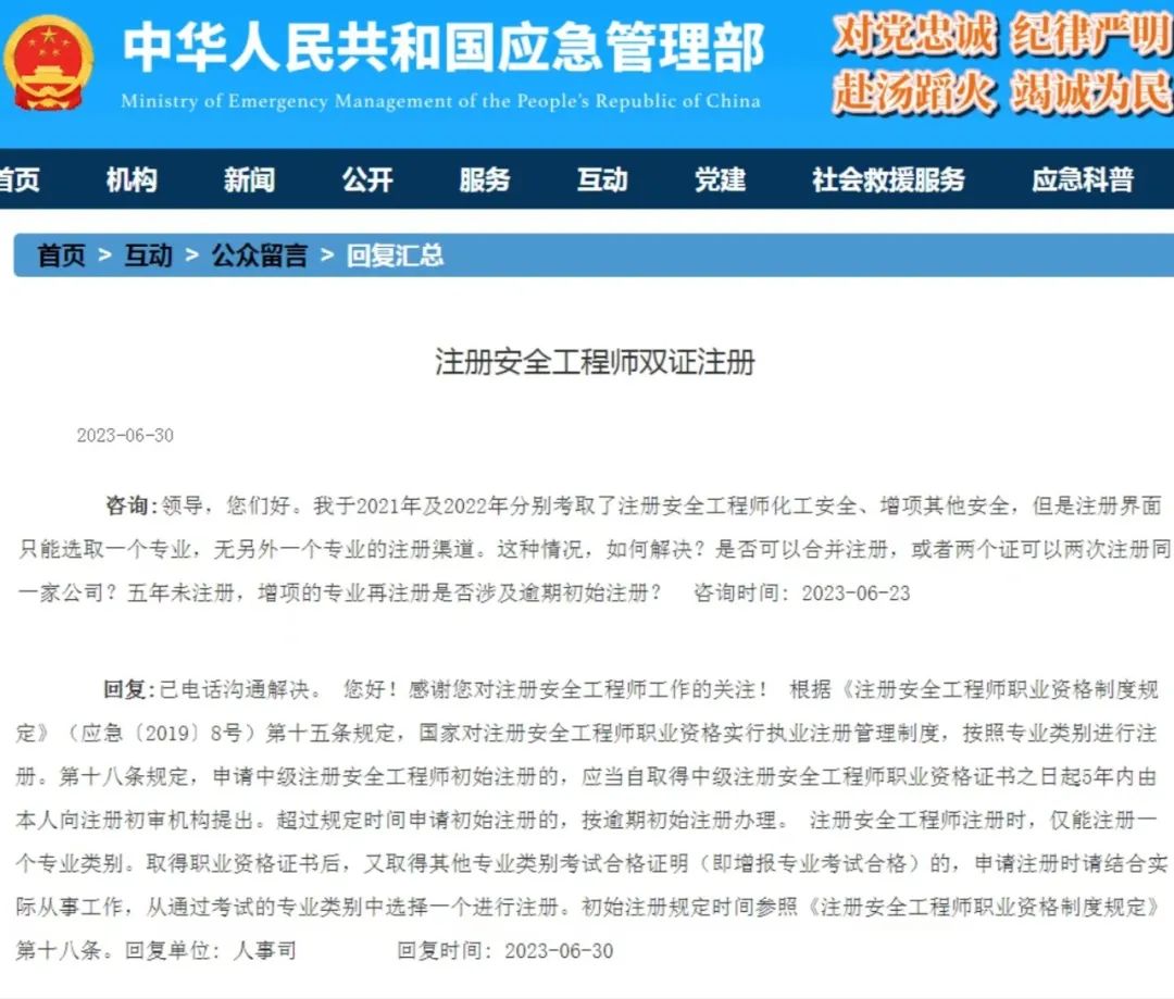 近期,有網友咨詢關于注冊安全工程師雙證注冊的問題,應急管理部給出了相應回復,具體內容我們一起來看看吧~