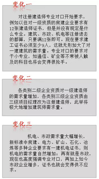 去年,國家公布了最新的企業資質標準,對各資質等級、各專業單位建造師證書的擁有量作了明確的規定。這一規定明確表達了建造師考試肯定是不會取消了。這一新的資質標準與以往相比有三方面變化。