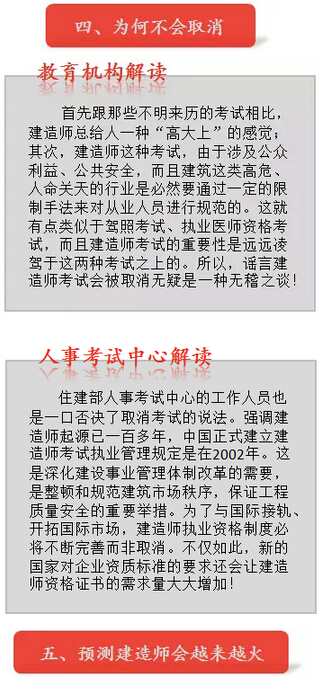 當然,國家取消這類考試也是為了改革、釋放創業創新活力。于是很多從事建筑的往往擔心政府將手腕伸向建造師考試,再加上周圍人不斷討論與煽動,不斷有考試在陸續被取消,建造師也就順其自然地成了人們討論的對象。