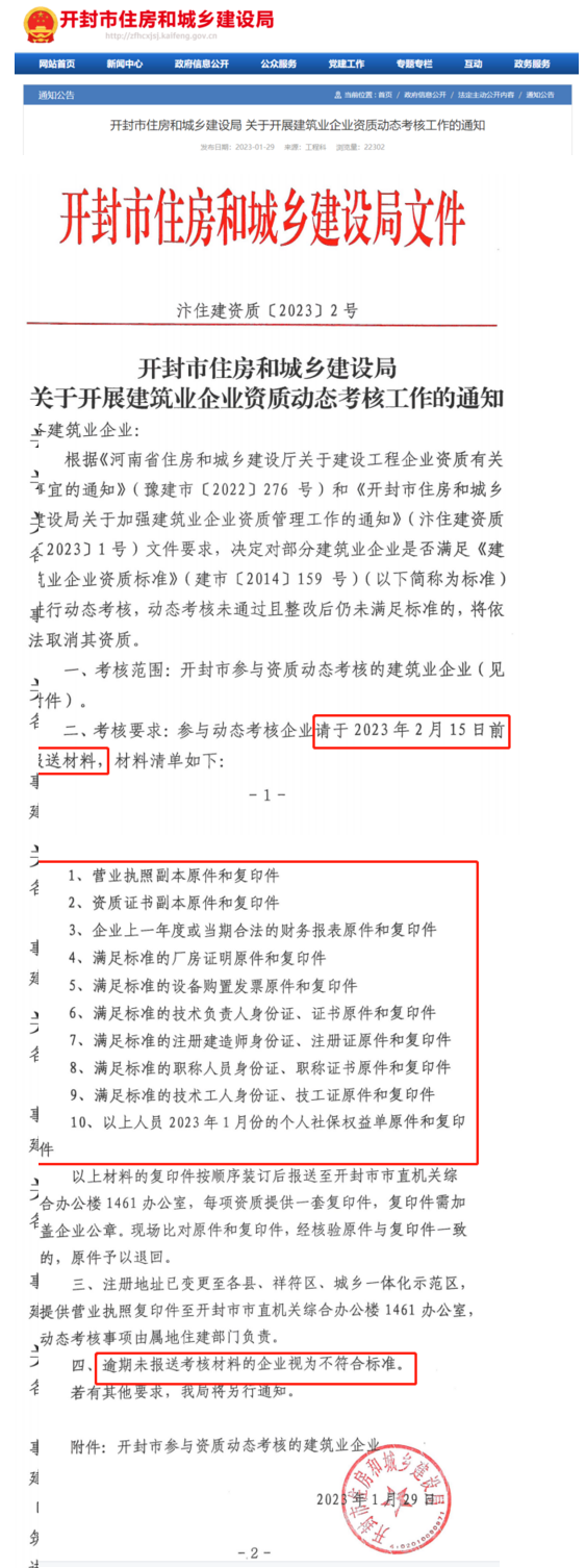 1月29日,開封市住建局發(fā)布《關于開展建筑業(yè)企業(yè)資質(zhì)動態(tài)考核工作的通知》,其中: